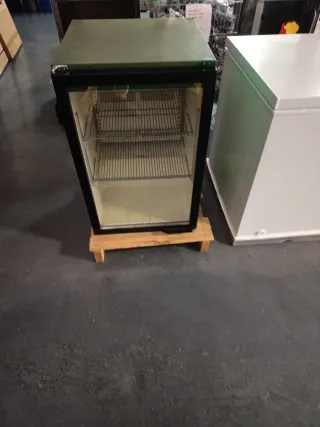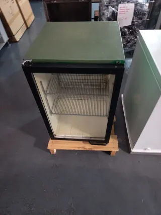 Nevera expositora con puerta de cristal, ideal para bebidas y refrescos. Cuenta con estantes interiores para organizar el contenido.,venta y alquiler Fallas Magdalena 2026 mobiliario y maquinaria hostelería Valencia Paiporta Massanassa Catarroja Sedaví Alfafar - Color verde en la parte superior. - Estructura negra. -kioskos bares restaurantes take aways