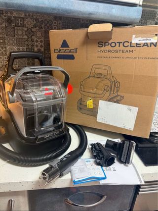 Se vende limpiador de tapicerías Bissell SpotClean Hydrosteam. - Incluye el limpiador, manguera, accesorios y manuales. - Diseñado para alfombras y tapicerías.