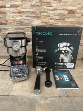 Cafetera espresso Cecotec Cafelizzia 790 Steel Pro en acabado acero inoxidable. Incluye todos sus accesorios originales. - Bomba de presión de 20 bares. - Potencia de 1350 W. - Sistema Thermoblock para calentamiento rápido. - Vaporizador orientable para espumar leche. - Bandeja recogegotas extraíble.