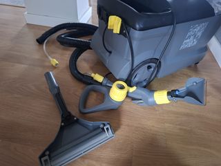 Aspiradora Karcher Puzzi 10/1 para limpieza de tapicerías, alfombras, sofas y colchones. - Diseño compacto y robusto. - Manguera de aspiración. - Boquilla de aspiración. - Depósito de agua limpia y sucia.