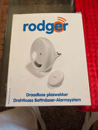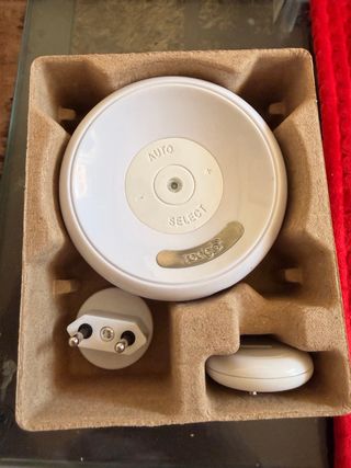 Alarma de la marca Rodger, modelo Euritis. Incluye el dispositivo principal, un enchufe y un accesorio adicional. - Diseño circular y blanco. - Indicadores 'AUTO' y 'SELECT'. Lo hemos utilizado con nuestra hija y nos ha dado resultados en 2 semanas. Funciona de maravilla, nos ha salvado de noches de llanto y de cambiar sabanas.