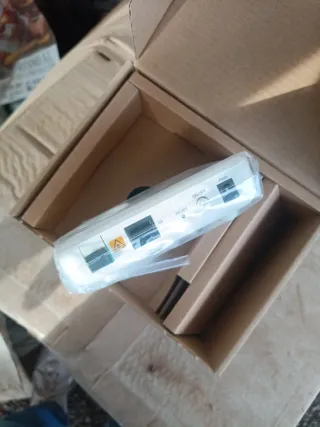 Terminal de red óptica (ONT) de la marca Nokia, completamente nueva y en su embalaje original. - Diseño compacto y moderno. - Indicadores LED para estado de Power, Alarm, PON y LAN. Incluye cable de red y fibra óptica