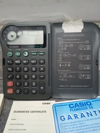 Calculadora Casio QA-100GY con función de reloj analógico y alarma integrada. Incluye manual de instrucciones y certificado de garantía. Calculadora vintage TIME FACE.Nunca usada..Está tal cual se compró en tienda. Ideal coleccionistas - Calculadora de mano. - Reloj analógico. - Alarma. - Manual de instrucciones. - Certificado de garantía. L