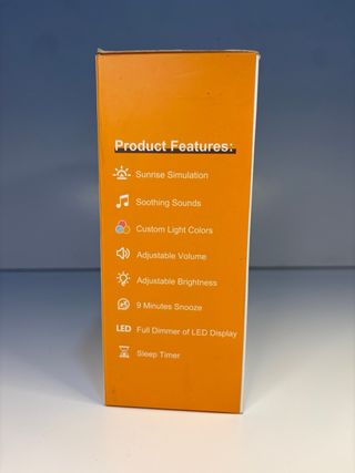 Despertador con simulación de amanecer. - Diseño esférico con luz cálida. - Alarma - Base gris con pantalla digital. - Zona de sonido incluida - Radio