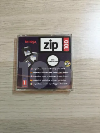 Disco de almacenamiento Iomega Zip de 100 MB. Ideal para copias de seguridad y transporte de archivos. - Capacidad de 100 MB. - Compatible con sistemas IBM.
