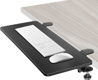 Plataforma de extensión para escritorio, ideal para mejorar la ergonomía. - Diseño con acabado texturizado. - Se sujeta al escritorio mediante abrazaderas. - Incluye un teclado blanco y un ratón blanco.
