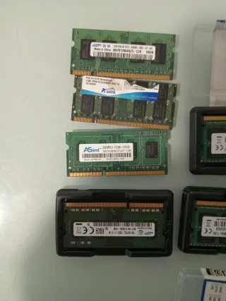 Conjunto de módulos de memoria RAM DDR3 para ordenadores portátiles. Incluye varias marcas reconocidas. - Módulos de memoria DDR3. - Compatibles con portátiles.