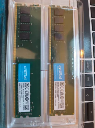 Dos módulos de memoria RAM Crucial. - Capacidad: 4GB cada uno (total 8GB). - Tipo: DDR4 UDIMM. - Velocidad: 2666MHz. - Voltaje: 1.2V. - Latencia: CL19. - Fabricado en Malasia.