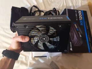 Fuente de alimentación modular Corsair HX1200i, version tope de gama con certificación de platino, lo mas eficiente posible. Con su caja, cables y accesorios. Es de las mejores fuentes del mercado, puede alimentar varias graficas al mismo tiempo, regula la velocidad del ventilador sola, lo apaga cuando no es necesario, software para controlar cada detalle... Una pasada. Estoy vendiendo mi ordenador entero por piezas