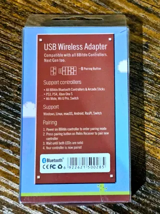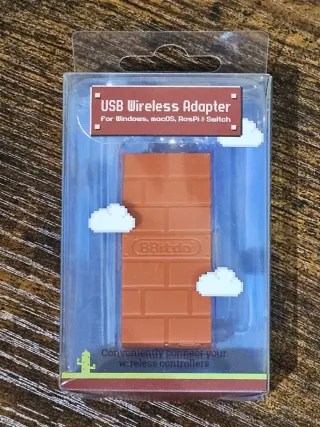 Adaptador USB inalámbrico de 8BitDo en perfecto estado. Permite conectar casi cualquier mando (PS5, PS4, Xbox, Wii U Pro) a tu Nintendo Switch o PC. Características: Diseño compacto tipo "brick", conexión estable y muy fácil de emparejar. Compatibilidad: Switch, Windows, macOS, Raspberry Pi y más. Adaptador USB inalámbrico para conectar tus mandos de forma cómoda. Compatible con Windows, macOS, Raspberry Pi y Nintendo Switch. - Diseño inspirado en bloques de ladrillo. - Logo de 8BitDo en relieve.