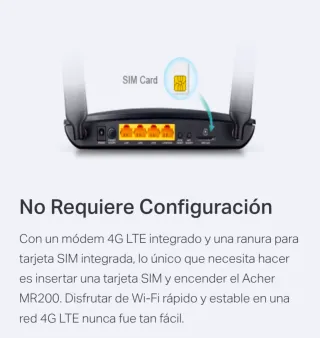 Router TP-Link Archer MR200 con conexión 4G LTE. Comprado 28/11/2025 se entrega con ticket de compra - Doble banda Wi-Fi AC750. - Compatible con 4G (TDD&FDD)/3G. - Velocidades de 300 Mbps + 433 Mbps en Wi-Fi Dual Band. - Antenas LTE desmontables para un mejor rendimiento. - Funcionalidad Plug & Play con SIM. - Compatible con OneMesh.