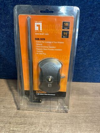 Antena omnidireccional LevelOne OAN-1070 para exteriores con ganancia de 7 dBi, ideal para ampliar cobertura Wi-Fi en redes de 2.4 GHz (802.11b/g/n). Conector tipo N hembra, carcasa resistente al agua (IP65), diseñada para montaje en mástil o pared. Ángulo de cobertura 360°, frecuencia 2.4–2.5 GHz, VSWR 1.5, impedancia 50 Ω. Temperatura operativa -40 °C a +80 °C. Longitud 41,5 cm. Mejora la señal en jardines, patios, zonas abiertas o instalaciones industriales. Compatible con routers, puntos de acceso o adaptadores con conector N.