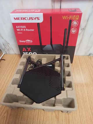 Router Mercusys AX1500 con tecnología Wi-Fi 6. Compatible con Easy Mesh. - Modelo: MR60X Incluye caja original cable de alimentación y cable de red. EXcelente estado del producto y de su caja original - Color: Negro - Diseño con antenas externas