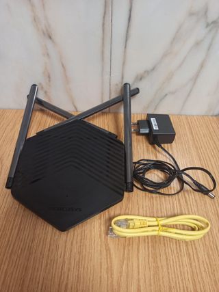 Router Wi-Fi con dos antenas para una mejor cobertura. - Puertos Ethernet disponibles. - Adaptador de corriente incluido.