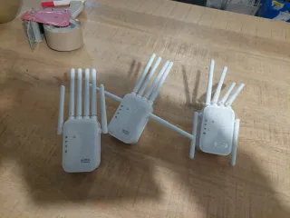 Conjunto de tres repetidores WiFi para ampliar la cobertura de tu red inalámbrica. Diseñados para ser discretos y eficientes. - Tres unidades incluidas. - Diseño compacto con antenas. - Indicadores LED de estado.