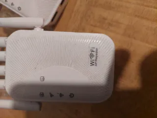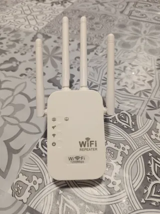 repetidor WiFi de doble banda Newfast 1200Mbps (Modelo: NF-RE523). Sus características clave incluyen: Velocidad de hasta 1200 Mbps (300 Mbps en 2.4 GHz y 867 Mbps en 5 GHz). Doble banda (2.4 GHz para largo alcance y 5.8 GHz para menos interferencias). Cuatro antenas externas giratorias de 3dBi para una cobertura mejorada. Múltiples modos de funcionamiento: repetidor, AP (punto de acceso) y router. Pantalla LCD inteligente y configuración sencilla (botón WPS o página web). Incluye un puerto Ethernet.