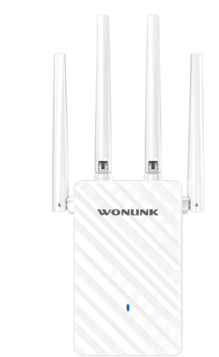 Repetidor WiFi de la marca WONLINK, modelo 3503-2. Diseñado para ampliar la cobertura de tu red inalámbrica. - Cuatro antenas externas para una mejor señal. - Indicador LED de estado. - Diseño compacto y moderno.