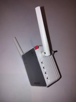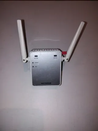 Amplificador de señal WiFi NETGEAR para extender la cobertura de tu red inalámbrica. - Antenas ajustables para optimizar la recepción. - Indicadores LED para el estado de la conexión. Sin usar.