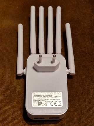 Extensor / repetidir de alcance WiFi para mejorar la cobertura de tu red inalámbrica. Soporta más de 50 dispositivos conectados. Compatibilidad universal con cualquier router. Medidas: 18 cm de alto x 5,5 cm de ancho y 3,4 cm de fondo. Gran poder para atravesar muros y paredes mejorando la cobertura en toda la casa. - Frecuencia de 2.4 GHz. - Diseño con 6 antenas para mayor señal. - Indicadores LED de estado. - Fácil de configurar. - Instrucciones en varios idiomas incluido el castellano. Solo utilizado para comprobar su buen funcionamiento. Entrega en mano en Alcorcón o envío a través de wallapop.
