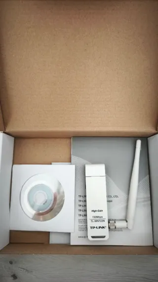 Adaptador USB inalámbrico de alta ganancia TP-Link. - Velocidad de 150 Mbps. - Antena externa para mejor rendimiento. - Configuración de seguridad con un solo botón (WPS). - Compatible con Wi-Fi CERTIFIED.
