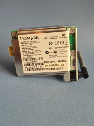 Tarjeta Wi-Fi Lexmark N2052 con antena para impresora. Modelo 14T0355 / Lex-M01-001. Añade conexión inalámbrica a impresoras Lexmark compatibles para imprimir sin cables. Wi-Fi 802.11 b/g/n (2,4 GHz). Guardada funcionando, retirada de impresora operativa. Incluye tarjeta y antena original. Entrega en mano o envío por Wallapop.