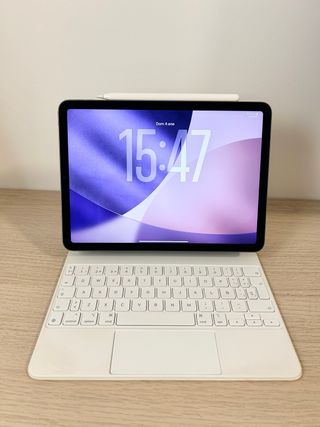 Se vende iPad Air de 5ª generación con 64 GB de almacenamiento, en color plateado y blanco. Incluye accesorios: Magic Keyboard (blanco) y apple pencil (magnético). - iPad Air (5ª generación) - 64 GB de almacenamiento - Color plateado y blanco - Magic Keyboard -Apple pencil magnético