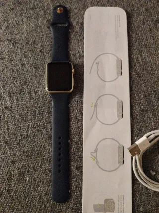 Reloj inteligente Apple Watch Sport con caja dorada y correa azul marino. NO ENCIENDE, aparece el símbolo de apple pero no hace nada mas Lo vendo con el cargador - Caja de aluminio. - Correa deportiva de fluoroelastómero.