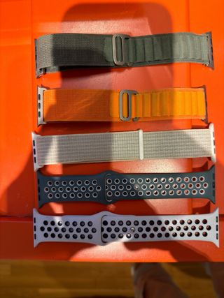 Lote de 5 correas para Apple Watch en diferentes colores y estilos. - Correa deportiva de silicona con perforaciones. - Correa de tejido con cierre de velcro y hebilla. - Colores disponibles: verde, naranja, gris, azul y blanco.
