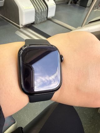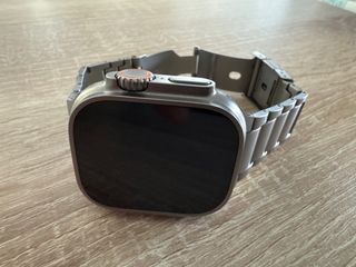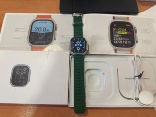 Smartwatch estilo Apple Watch Ultra — NO es Apple original. Compatible con Android e iOS, se empareja mediante app (en las fotos se ve conectado al móvil). Permite llamadas Bluetooth, notificaciones, control de música y cámara, monitor de pasos, sueño y ritmo cardíaco. Incluye varios modos deportivos, pantalla táctil a color, correa resistente y buena autonomía. Funciona todo perfectamente.