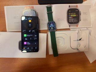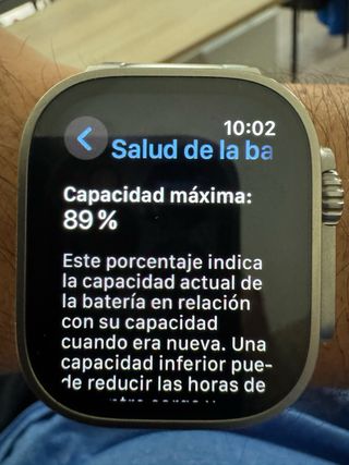 Reloj inteligente Apple Watch Ultra en color plata. Se encuentra en muy buen estado. - Diseño elegante y duradero. - Correa de titanio - Pantalla de alta resolución. - Correa adicional naranja - Salud de la batería al 89%. - Se conserva la caja original. - Cable de carga.