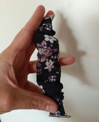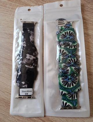 Dos correas elásticas para Apple Watch de 38/40mm. - Correa con estampado floral en negro. - Correa con estampado geométrico en verde y azul. - Talla S/M.