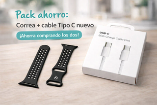 Pack completo: correa deportiva para Apple Watch + cable tipo C 60W. Ideal para renovar tu reloj y tener un cable resistente para el día a día. ✔️ Producto nuevo ✔️ Envío preparado al día siguiente ✔️ Ahorro frente a comprar por separado Incluye: – Correa deportiva de silicona, cómoda y resistente (color negro) – Cable USB-C a USB-C 60W (1 m), compatible con carga rápida Packs disponibles: • 1 correa + 1 cable → 9,99 • 2 correas + 2 cables → 18 • 3 correas + 3 cables → 26 📌 Este anuncio es solo para el pack conjunto. 📌 Correa o cable por separado en otros anuncios.