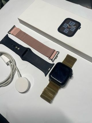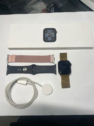 Reloj inteligente Apple Watch SE de 40mm. - Incluye correa de malla milanesa dorada. - Incluye correa deportiva negra. - Incluye correa de malla milanesa rosa. - Cargador magnético.