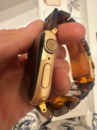 Reloj inteligente Apple Watch Series 10 en color oro con correa multicolor. - Tamaño de caja de 42mm. - Incluye cargador y protector de pantalla. -bateria al 99% Se vende con correa original rosa y alguna correa mas (Unico defecto la parte trasera esta un poco arañada por el lado no afecta at rendmiento)