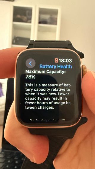 Apple Watch Series 4 en color beige y oro. La pantalla muestra la salud de la batería. - Capacidad máxima de la batería: 89%. - Indica la capacidad actual en relación con su capacidad original.