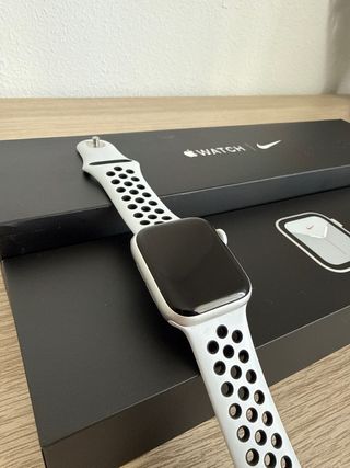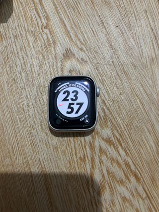 Apple Watch Series 5 Nike Edition en color plata y blanco. Modelo de 40mm. El Apple Watch no tiene ralladuras ni en la parte trasera, delantera, ni laterales. Siempre tuvo cristal y carcasa. Lo vendemos porque mi mujer cambio a otro reloj. Tiene poco uso. Lo compramos nosotros directamente en la tienda apple. Incluye: - Caja de aluminio. - Correa deportiva Nike. - Esfera exclusiva Nike. - Todas las cajas originales. - Cargador y cable original. - Muchas correas de diferentes colores y tipos (Ninguna original).