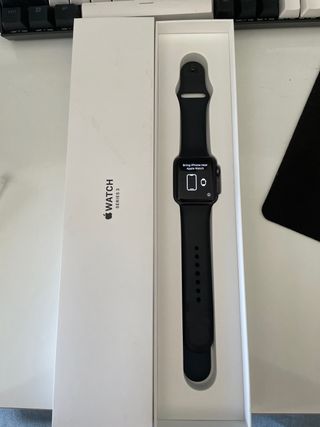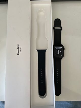 apple watch series 3 42mm aluminio color negro,funciona perfectamente , no tiene arañazos ni desperfectos, me lo compre cuando lo sacaron pero me lo he puesto hasta ahora unas 10 veces, lo e estado cargando de vez en cuando para que no estuviese siempre apagao, correa negra original talla s/m y m/l , regalo la azul que no es original, el cargador es el original, tiene la ultima actualizacion del software, si lo vendo lo reinicio de fabrica, la salud de bateria esta a un 87% he estado informandome y todos los que he encontrado estan igual, la bateria suele durar 2 dias, caja incluida