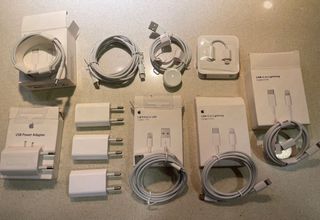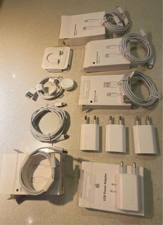 Lote de accesorios de carga para iPhone. - 4 adaptadores de corriente USB. - 2 cables USB-C a Lightning. - 1 cable Lightning a USB. - 1 cargador de Apple Watch. ENTREGA EN MANO 11 PIEZAS EN TOTAL