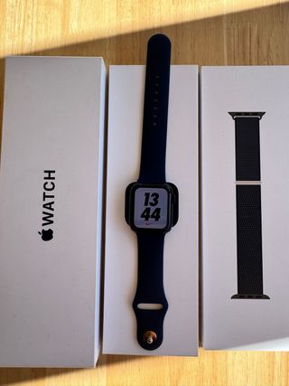 Apple Watch SE 2 40mm en color negro y azul marino. Incluye caja original y correa original + cargador original ademas de la correa de las fotos. Muy buen estado y funciona a la perfección.