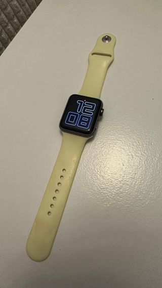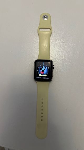 Reloj inteligente Apple Watch Series 3 en color gris con una correa intercambiable en tono amarillo. - Caja de aluminio gris espacial. - Correa de silicona amarilla. Tengo varias correas aparte CARGADOR ORIGINAL Negociable