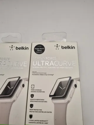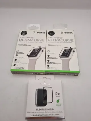 Lote de protectores de pantalla para Apple Watch. - Dos protectores Belkin Screenforce Ultracurve. Series 3/2 42mm y 38mm - Un protector Puro Flexible Shield. - Compatibles con Apple Watch Series 7/8/9 de 41mm.