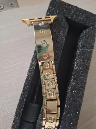 Pulsera dorada con adornos de brilantitos para Apple Watch. Diseñada para un ajuste cómodo y seguro. - Material duradero. - Cierre ajustable.