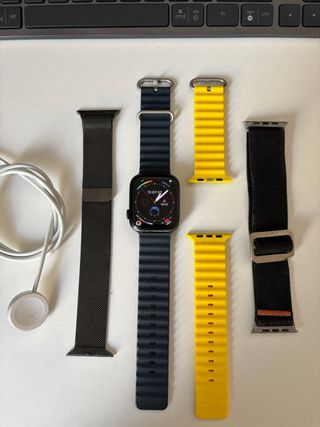 Reloj inteligente Apple Watch Series 7 de 45mm con GPS. Incluye varios correas. - Correa de malla milanesa negra original apple ( 20€ mas) - Correa deportiva azul marino. - Correa deportiva amarilla. - Correa de tela negra. Bateria al 84% de salud. Aguanta un dia sin problemas. Tiene rasgos pero funciona al 100%.