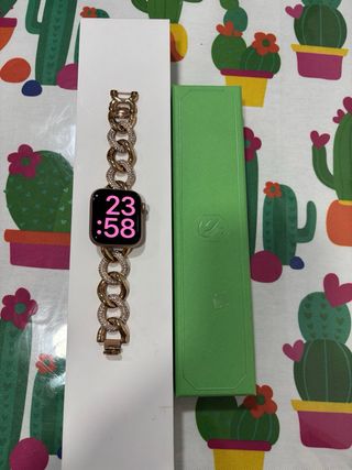 Reloj inteligente Apple Watch Series 5 en color dorado. Incluye una elegante correa de eslabones con incrustaciones. - Correa de eslabones dorados. - Detalles brillantes en la correa Swarovski que esta en web 220€ y tiene 3 meses. Se entrega con su cargador y correa origina ( blanca ) no tengo la csja del Apple Watch serie 5 pero conservo la del 3 y se mandaría en esa. Bateria 83%