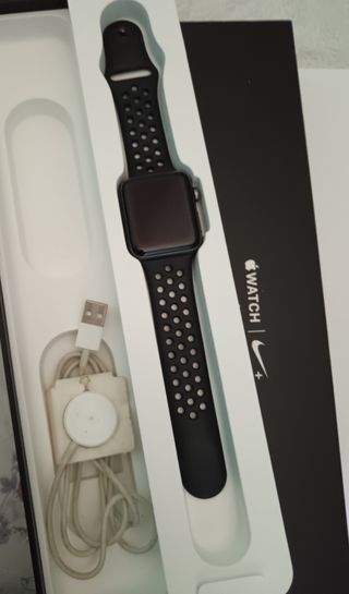 Apple Wach serie 3 nike. Pantalla de 42 mm. Ya no se puede actualizar. La bateria esta al 73 %. Lo vendo por que ya no vale para mi iphone 16. Sigue funcionando con el iphone 11. Esta con su caja, correa mas larga y cargador. Esta con protector.