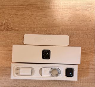 Reloj inteligente Apple Watch Series 5. - Color: Plateado - Modelo: Series 5. - A veces se sobrecalienta un poco al cargar, pero funciona bien. No incluye la caja original, pero si una caja. Tampoco incluye el cargador ni el cable original pero sí que se entrega con un cargador.