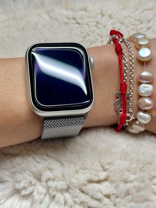 Apple Watch Series 5 con su elegante correa Milanese Loop en acabado gris plateado. - Caja de aluminio. - Pantalla Retina. - Correa de malla de acero inoxidable. - Cargador. - Cable de carga nuevo.