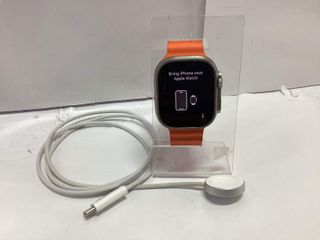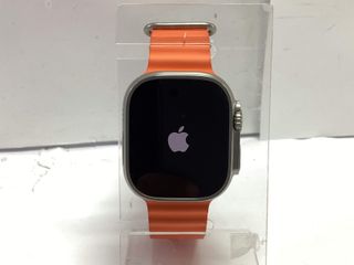 Reloj inteligente Apple Watch Ultra 2 con correa de color naranja y caja plateada. Salud de bateria 98% - Protector de pantalla. - Correa de tejido deportivo. - Cable de carga magnética incluido. Sin caja, con factura de compra.