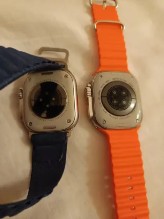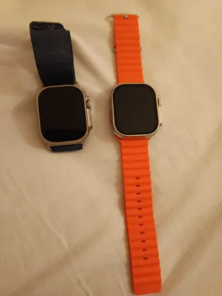 Smartwatch con diseño tipo Apple Watch Ultra. Perfectos como reloj deportivo o para repuestos. Incluye 2 unidades: 🟠 Uno con correa naranja de silicona tipo Ocean Band 🔵 Otro con correa azul tipo nylon ⚙️ Detalles: Pantalla grande y táctil Sensor de ritmo cardíaco y pasos Notificaciones por Bluetooth Resistente a salpicaduras Correas intercambiables 🚫 Importante: No incluyen cargador No responden mensajes No se aceptan devoluciones Se venden tal cual están, para uso, prueba o piezas.