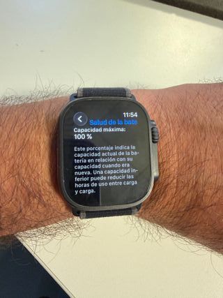 Reloj inteligente Apple Watch Ultra 2 en acabado de titanio negro. La pantalla muestra el estado de la batería. se entrega con correa deportiva nueva original negra, tiene alguna marca inapreciable en el marco del uso - Capacidad máxima de la batería: 100%.